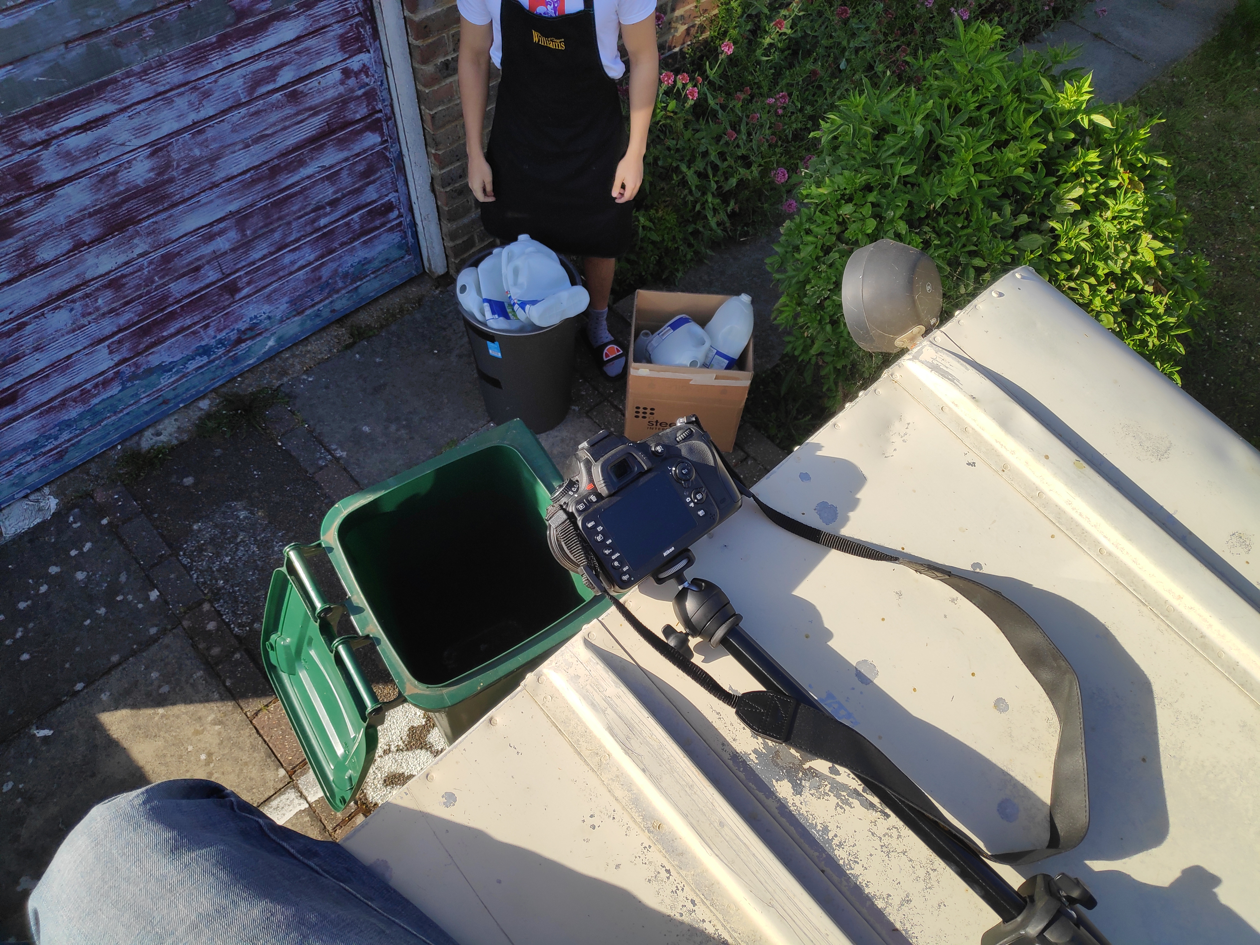 There were lots of time lapses taken from different angles, as well as regular shots from the same locations. The images just show a few of the shots. I even climbed on top of my car to get the right angle for the milk bottle bin shot.