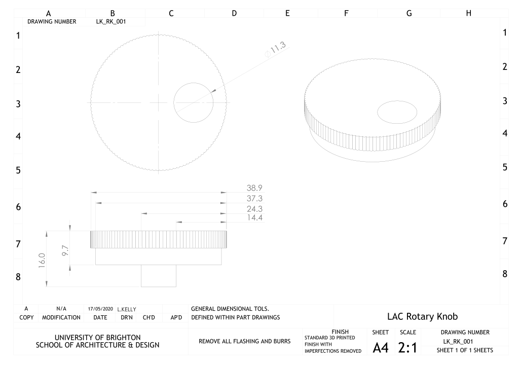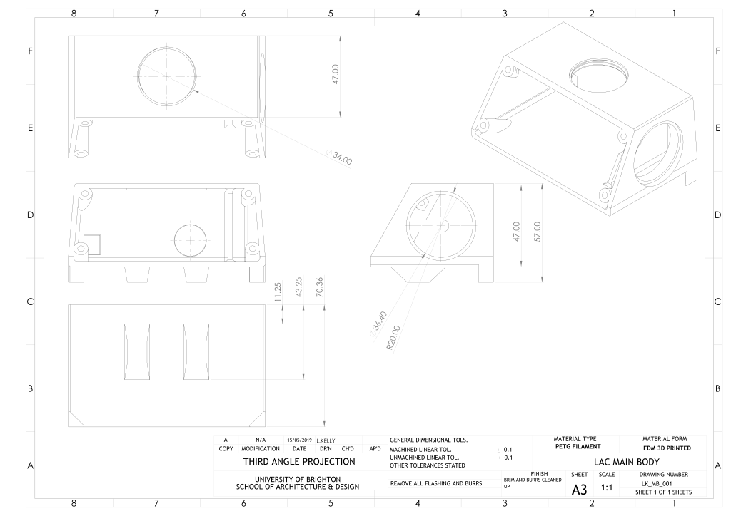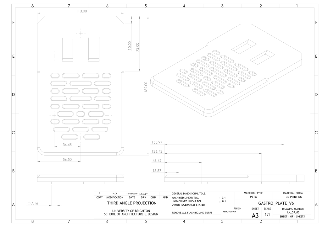 PETG is chosen over different materials, as it is easy to print with lower cost machines, has good resistance to chemicals so can be sanitised and is more resistant than PLA.