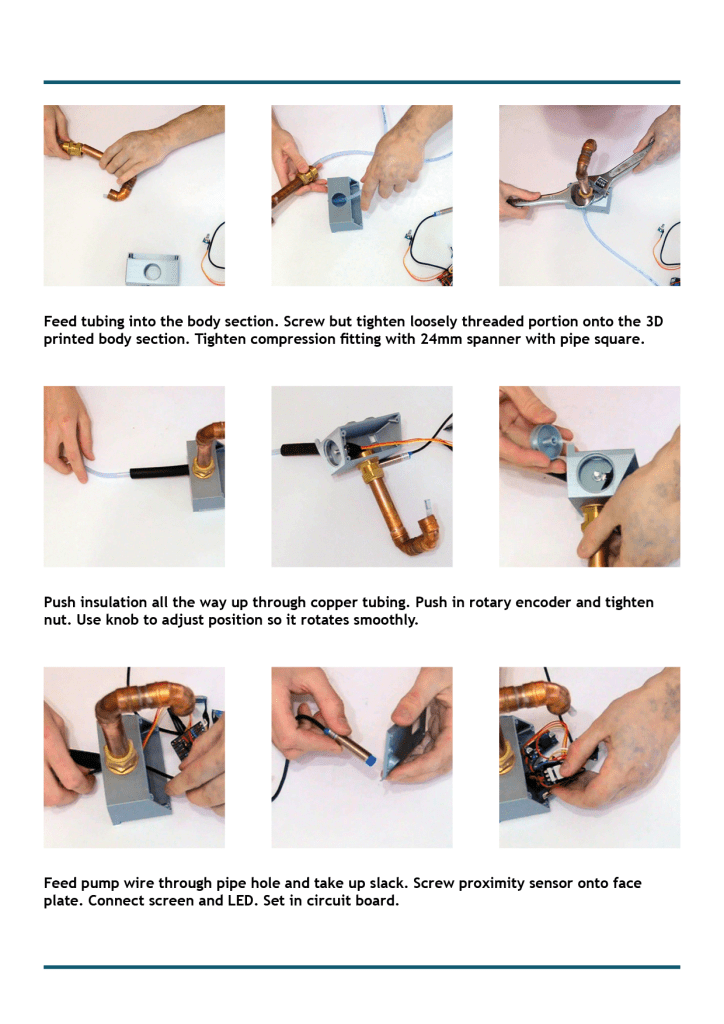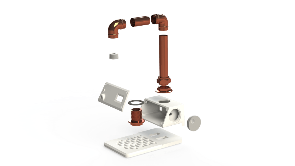 All electronic components would be sold as a kit and delivered as one package to the user. The 3D printed casing could be made locally by maker spaces or a FabLab. Alternatively it could be distributed with the electronics kit from a central hub. The 3D printed parts would be made from PETG which is recyclable and chemical resistant. Its hardwaring properties would mean that it would last for a long period of time before being replaced, mostly likely lasting indefintely. The silicone or pcv pipes would have to be replaced long before the casing.