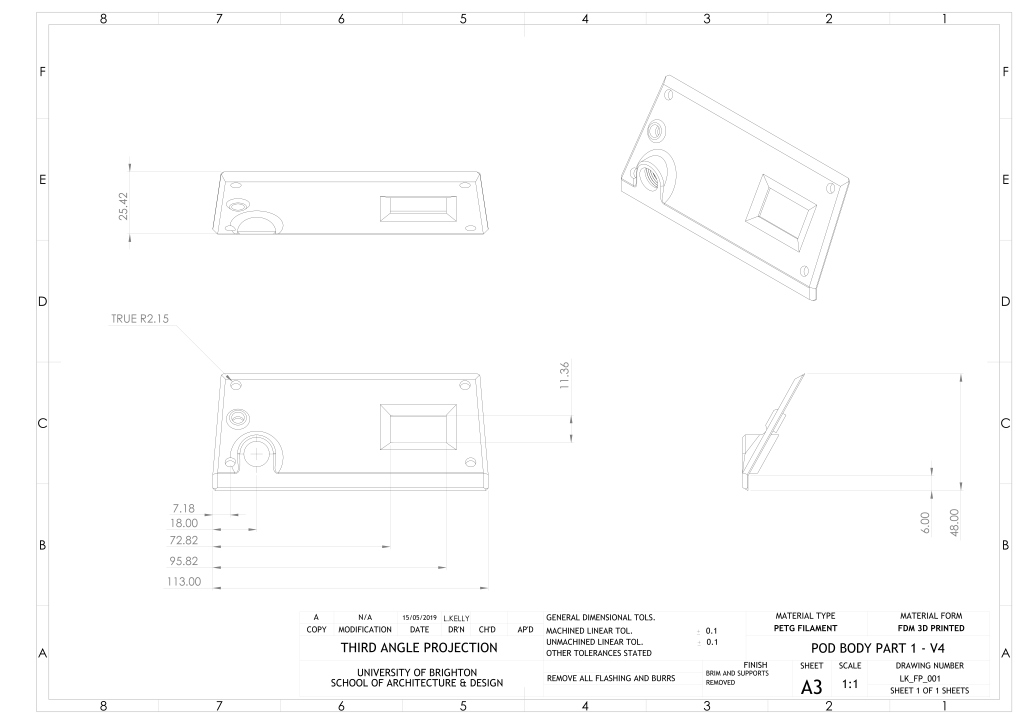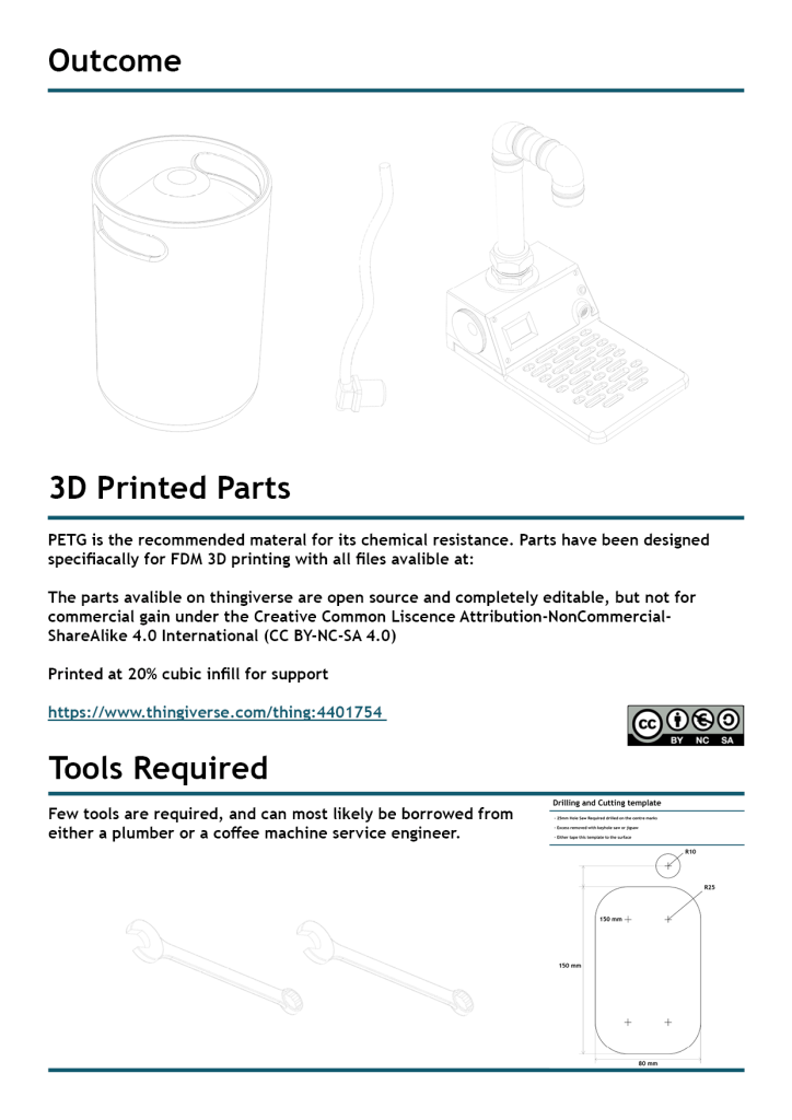 The main sections are 3D printed by the distribution as in the above diagram. The costs are shown in the BoM. This allows manufacture to be distributed and open source, reducing the environmental impact.