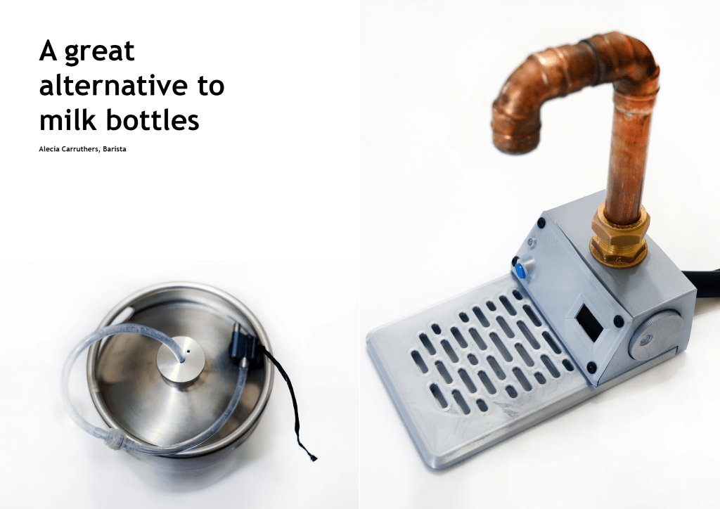 LAC is an alternative milk distribution and delivery method, using gastronorms, 3D printed parts and standardised fittings. The design combats both hygiene issues as well as the incredible volume of waste from the 4 pint milk bottles.