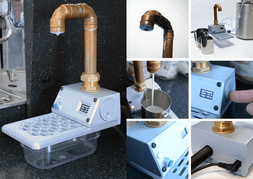 The design follows a distributed manufacture approach to create a cheaper and more repairable alternative to large costly systems. The 3D printer assembly, allows for a variety of standard pipe fittings and gastronormes to be used as a basis for the device. As a part time Barista I felt the current methods can be troublesome during busy periods, and following the Covid-19 pandemic heightened hygiene procedures would be necessary. I wanted to change this and ensure cafe can stay open and that customer and staff would feel safe.