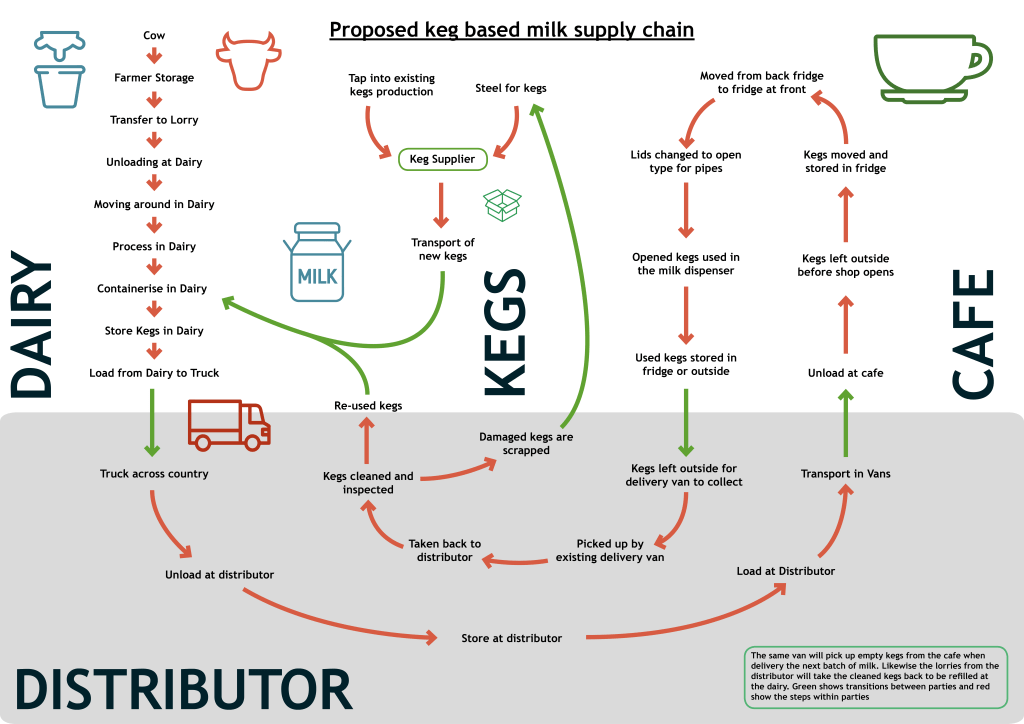 Ideally I would use existing beer kegs that have been properly cleaned and sterilised, however the kegs are normally held onto as assets until they cannot be safely used anymore. The problem with beer kegs is that they are large and overbuilt for milk, therefore bulky and unlikely to fit into fridge found at a cafe.