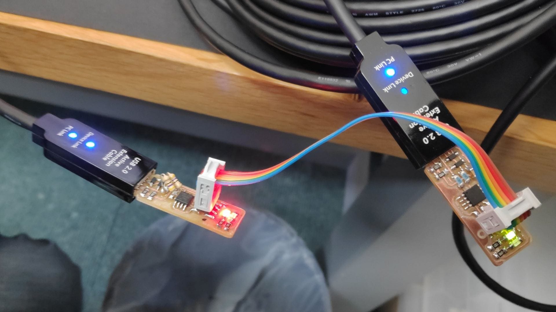 - Plug in your board using a USB extension to not mess up your computer USB ports as well as the programmer > connect their 2 ISP headers with a ribbon cable in the correct orientation